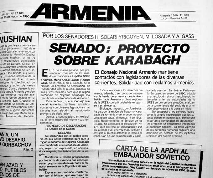 Al cierre de la edición mencionada (del 26 de enero), ARMENIA publicó un llamamiento de Artsaj dirigido a la URSS, a la RSS de Armenia, a los Parlamentos del mundo entero, a las Naciones Unidas y a todos los hombres de buena voluntad, manifestando que, desde el Karabagh Montañoso, la región de Shahumian y la subregión de Kedashén, se están defendiendo de la decisión ilegítima de Azerbaidján de separarlos de su patria histórica.