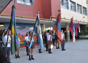 El gran patio del colegio resultó insuficiente para albergar a centenares de alumnos y los padres que tuvieron el deseo de participar de la tocante ceremonia donde con los abanderados al frente se entonaron los himnos patrios de Argentina y Armenia, además de las palabras de apertura y bienvenida pronunciadas por las respectivas directoras.