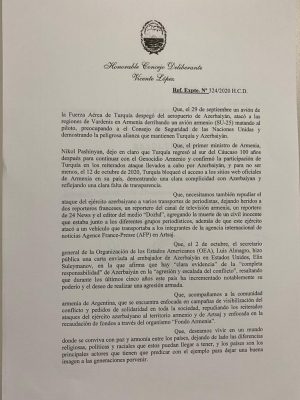 El Concejo Deliberante de Vicente López, provincia de Buenos Aires, Argentina, aprobó por unanimidad un repudio a los ataques de Azerbaiyán en Artsaj el 19 de noviembre. La resolución expresa el "mayor repudio a los ataques llevados a cabo por Azerbaiyán, atacando territorio vecino y violando los derechos humanos".
