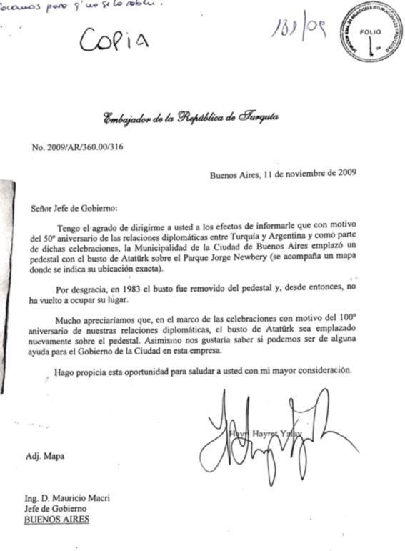 4 de febrero de 2010 dirigida al embajador turco, Santilli se comprometía “a poner en buen estado y forma el pedestal para el busto de Atatürk que sería colocado en el Parque 3 de Febrero” a pesar del aviso de la repartición técnica y legal de su propia estructura.