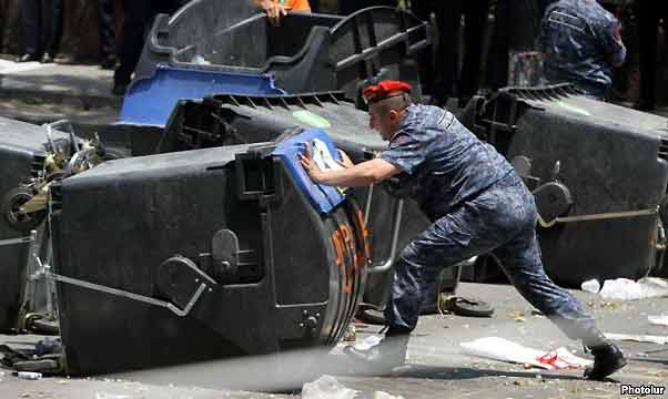 Sólo quedaban cerca de doscientos manifestantes acampados en la Avda. Baghramian cuando alrededor del mediodía decenas de efectivos policiales comenzaron a desmantelar la barricada. La acción de las autoridades no fue cruenta, sin embargo durante el procedimiento fueron detenidas medio centenar de personas.