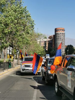 La caravana sudamericana armenia por el reconocimiento de Artsaj en Chile comenzó en la sede de la Colectividad Armenia de Santiago donde primero hicieron una parada en las afueras de la Embajada de Turquía, luego pasaron por la sede diplomática de Israel, continuaron por la embajada de Azerbaiyán para terminar el recorrido nuevamente en la sede armenia.