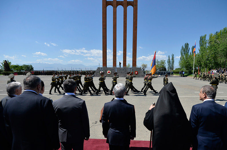 Luego, el jefe de estado depositó una ofrenda floral en memoria y homenaje a los héroes de la batalla de Sardarabad, para después presenciar la parada militar. A su término Sarkissian saludó a los participantes del desfile y se dirigió al Museo Nacional de Etnografía ubicado en el complejo. Allí recorrió la muestra dedicada a los maestros sirio-armenios del cobre titulada: "La Escuela de los Kalemkerian".